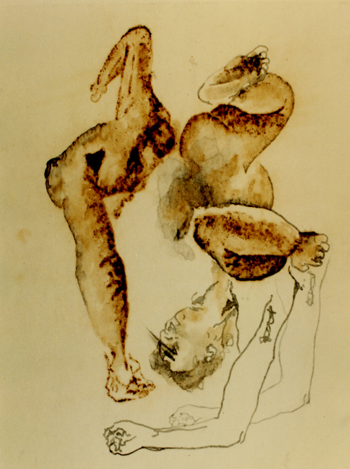 , 1990, Taken from the series "Falling Angels", Coffee, ink and acrylic glue on paper.